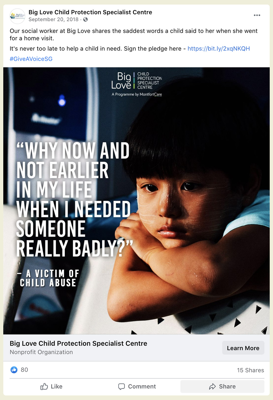 We also tested different educational content around child abuse issues through a variety of GIFs, testimonial quotes, images and videos. Real-life examples were gathered from Big Love’s social workers who shared about their experiences dealing first-hand with child abuse victims. The stories were then turned into images to create more authentic and emotive storytelling.