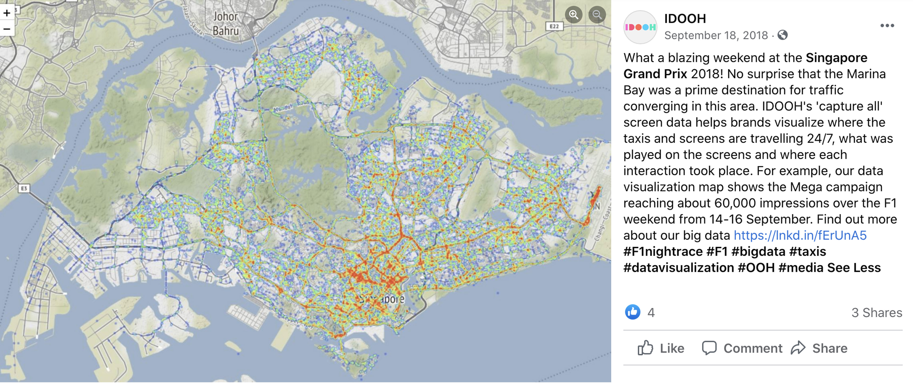 Using data visualisation of the Singapore island, we used this approach to visualise the Mega campaign results over the busy weekend during the Formula 1 Singapore Grand Prix 2018 – reaching 60,000 impressions on IDOOH screens across the city-state.