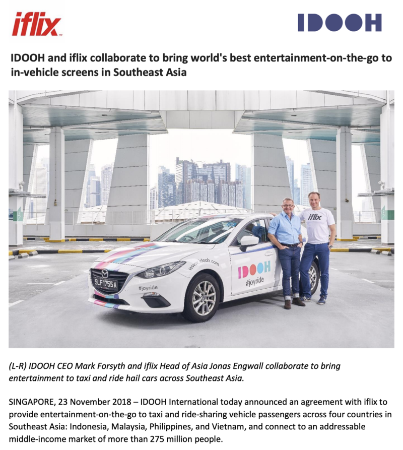 The seven-week campaign, which ran across 1,000 IDOOH in-taxi screens in Singapore from 28 September to 18 November 2018, resulted in a total of 1,637,001 impressions and 28,416 engagements, as well as an acquisition rate of 2% through 480 email addresses.