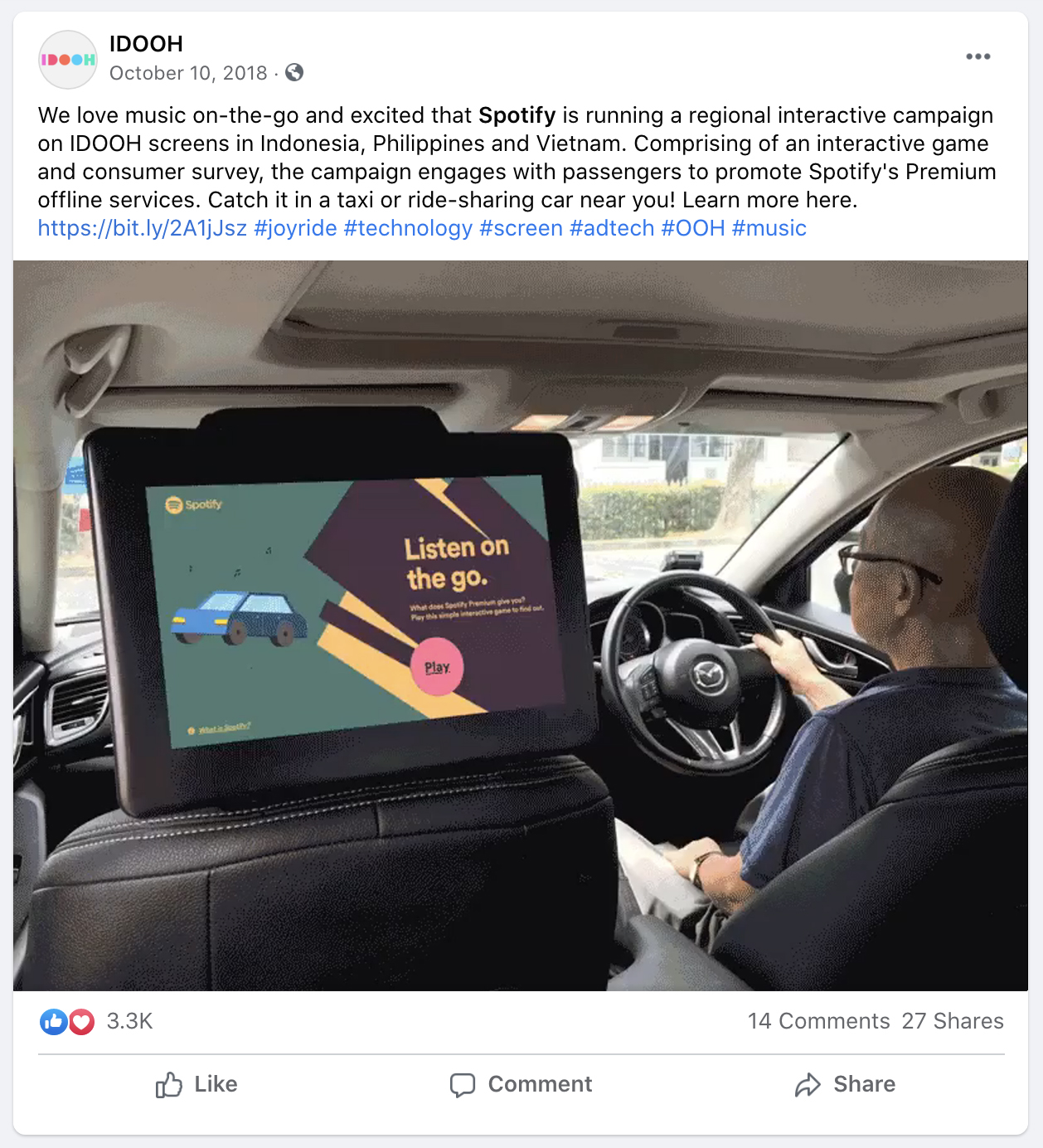 IDOOH’s Facebook campaign showcasing the regional Spotify campaign reached over 1.4 million people with 130,000 watching the video for 10-seconds or more.